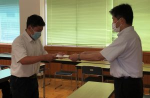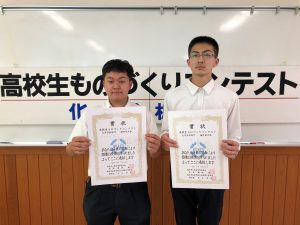 ものづくりコンテスト化学分析部門 2022.07.29 工業学科 機械創造科 7月26日(火)に科学技術高校で高校生ものづくりコンテスト化学分析部門の福井県大会が開催されました。化学分析部門では、滴定という方法で試料の水の硬度を測定する技術を競います。 本校からは機械創造科3年の明珍 泰雅君と抜井 龍聖君が参加しました。日頃の練習の成果を発揮し、見事 明珍君が最優秀賞、抜井君が優秀賞に輝きました。2人は8月に新潟県で開催される北信越大会に出場します。