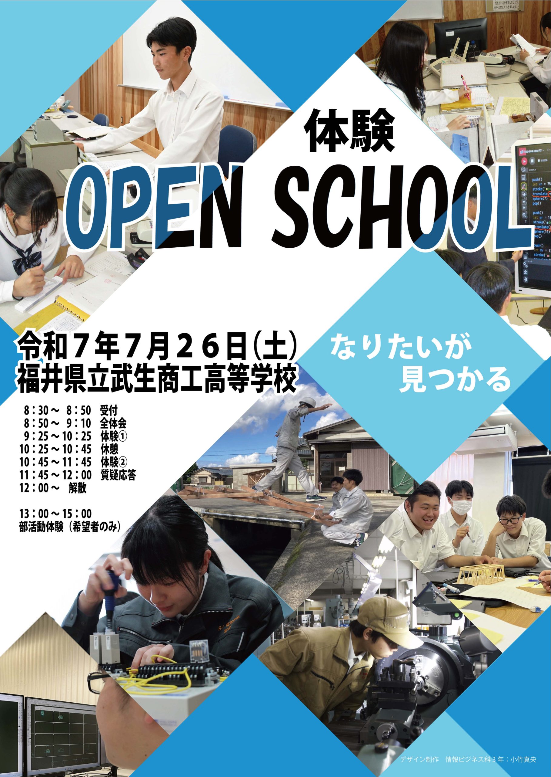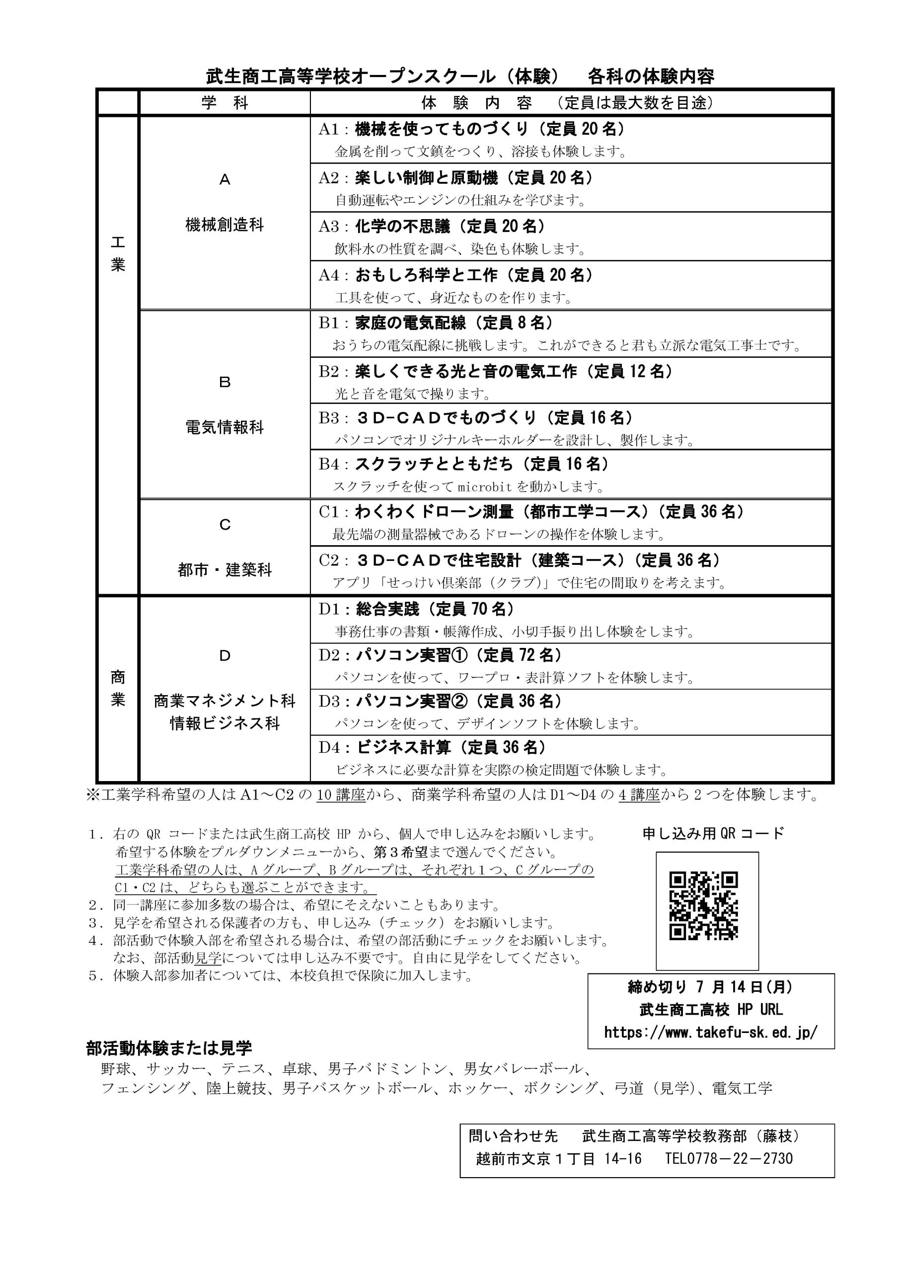 7月26日(土)オープンスクール(体験) 2025.06.27 お知らせ 中学生の皆さんへ 商業学科 学校行事 工業学科 部活動 武生商工高等学校オープンスクール(体験)が今年も開催されます。 中学生、保護者の方々の進路決定の手助けになればと思います。 以下の申込フォームよりどしどしご応募ください。 オープンスクール(体験)申込フォーム