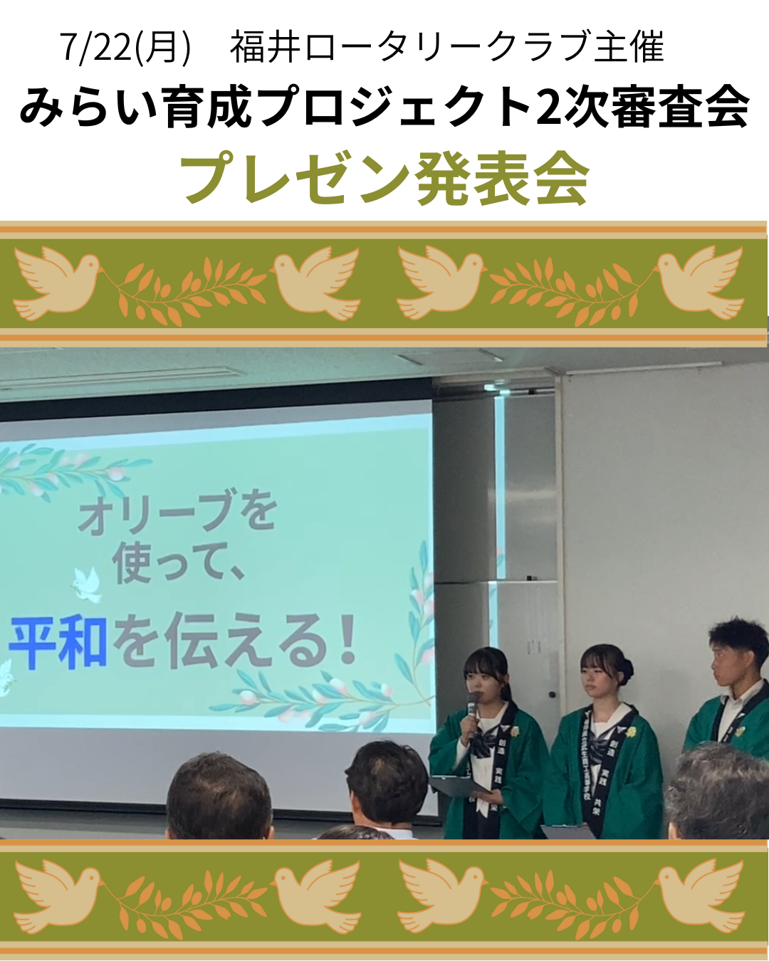 武生商工高校プロジェクト採択 2025.07.26 商業学科 武生商工高校の「Oli peace」です。 福井ロータリークラブ主催のみらい育成プロジェクトにて、私たちのプロジェクト内容が採択され、支援準備金として20万円を獲得しました。 プロジェクト名は「オリーブでつなぐ 平和と地域の未来」です。 オリーブの花言葉の一つに「平和」があります。オリーブは古くから平和の象徴とされてきました。 私たちはこのプロジェクトで、オリーブを使って、平和のメッセージの発信、農業支援、地域活性化を行います。そのためにオリーブリボンやオリーブソフトクリームを開発します。お楽しみに!