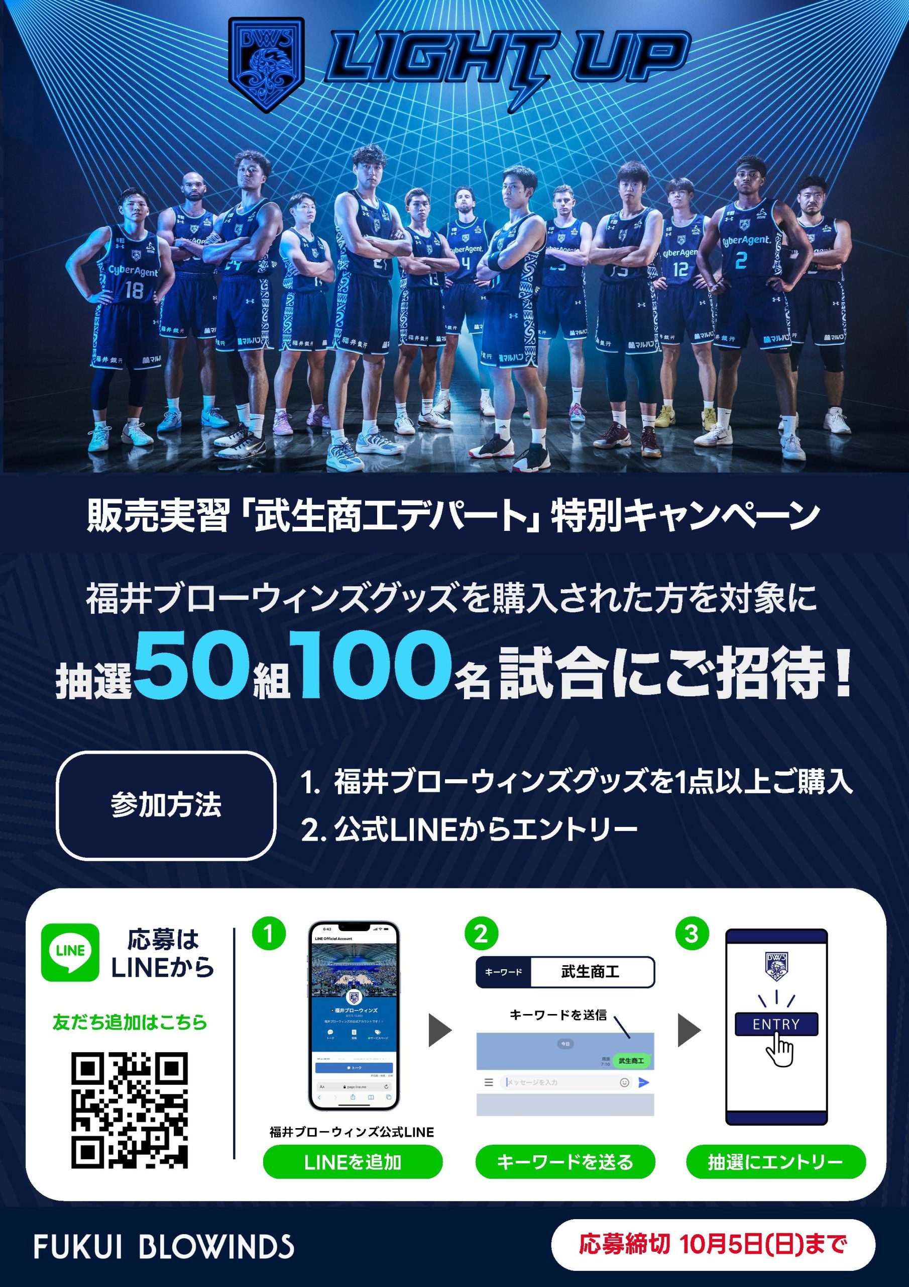 武生商工デパートで、福井ブローウィンズグッズを購入された方を対象に、抽選50組100名様を試合にご招待というビッグキャンペーンになります。