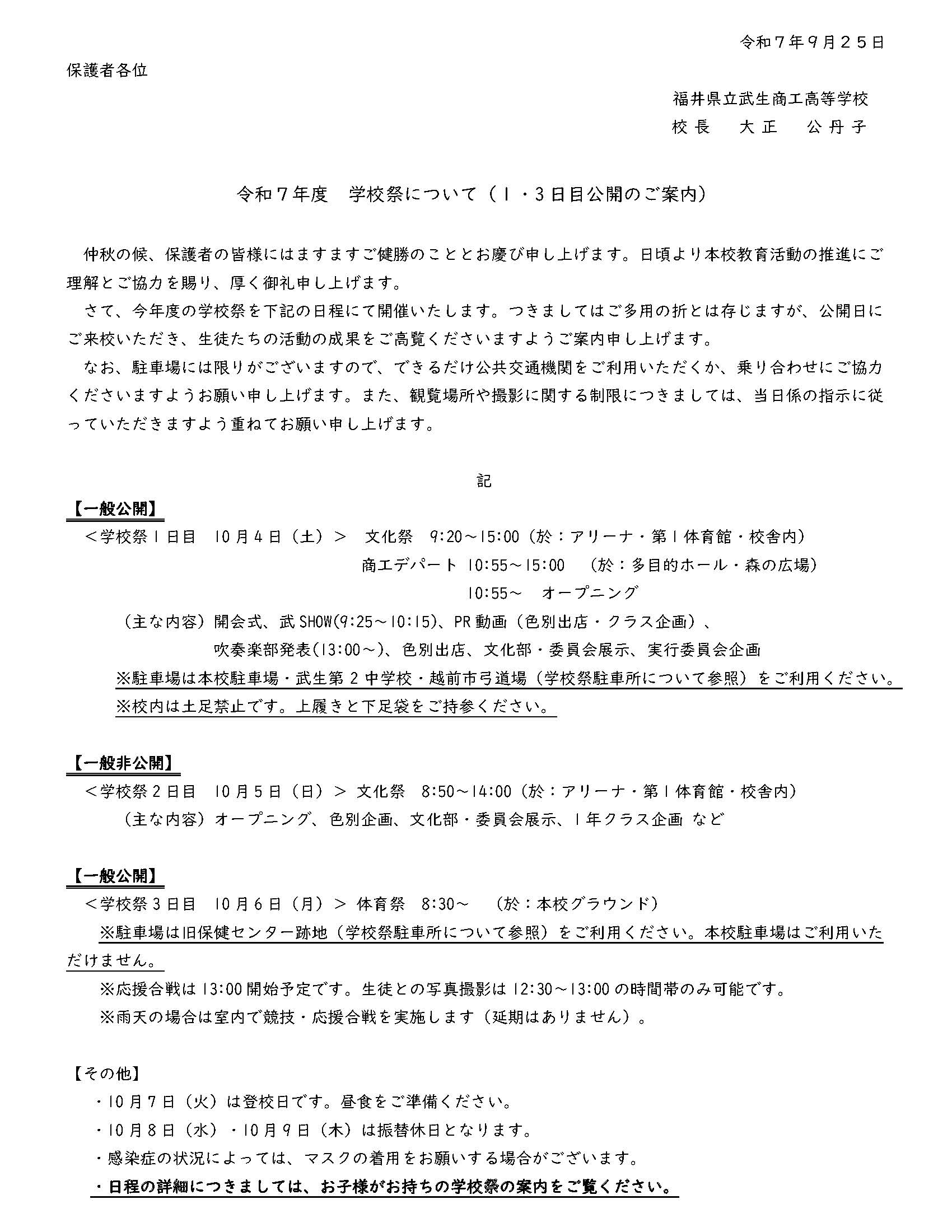 学校祭公開日と駐車場のお知らせ 2025.10.03 お知らせ 学校行事 武生商工デパート 10月4日(土)~6日(月)の日程で開催されます令和7年度学校祭について、日程と公開日のご案内、駐車場の場所と諸注意についてお願い申し上げます。 駐車場には限りがございますので、できるだけ公共交通機関をご利用いただくか、乗り合わせにご協力くださいますようお願い申し上げます。