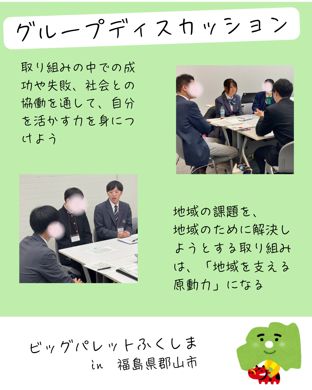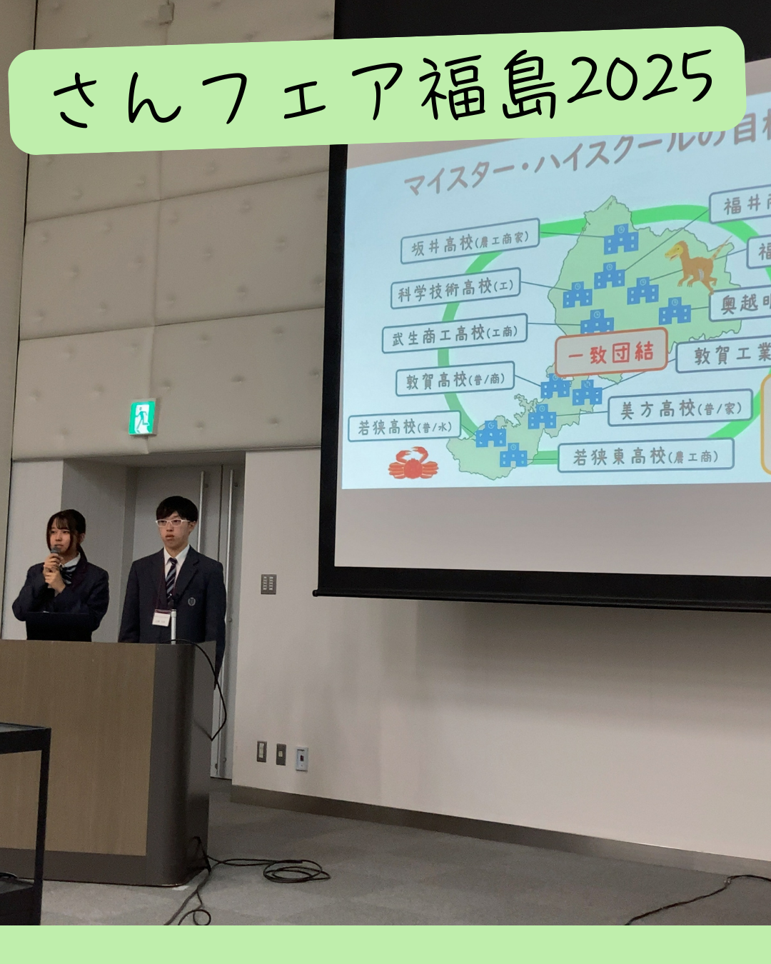 サンフェア福島2025 2025.10.27 マイスターハイスクール 商業学科 授業 10/26(日)福島県郡山市、ビッグパレットふくしまで2年生課題研究の発表をしてきました。 マイスター・ハイスクール普及促進事業の拠点校として、坂井高校と合同で行いました。 全国各地の高校生とのグループディスカッションも行いました。