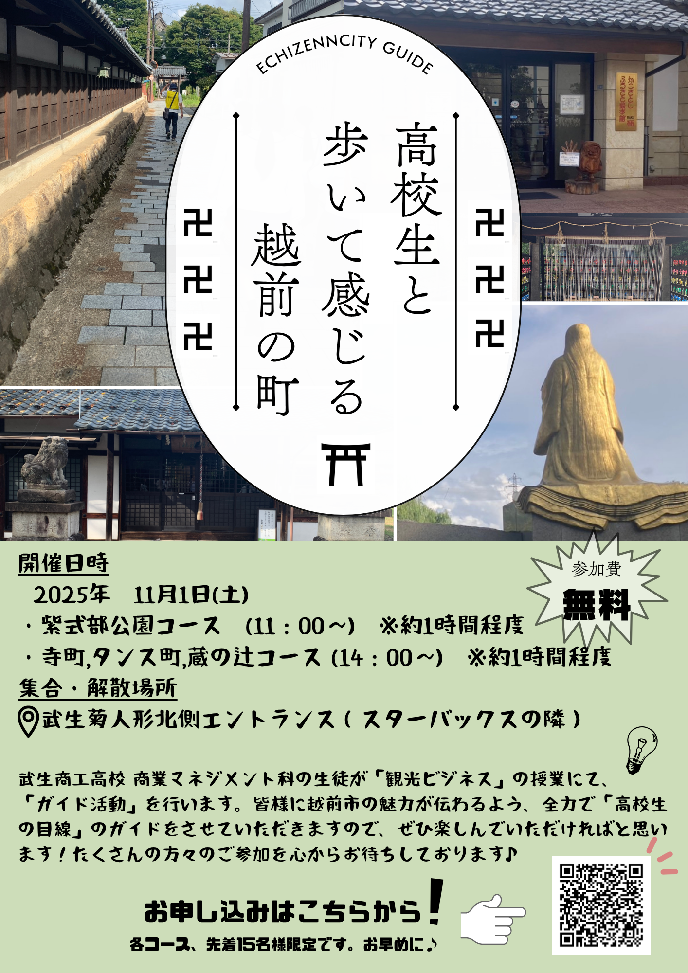 今週の11/1(土)には越前市のまちなかガイド(紫式部公園ルート・タンス町、寺町、蔵の辻ルート)をさせていただきます!この経験を生かして頑張りますので、たくさんの方々のご参加お待ちしております!