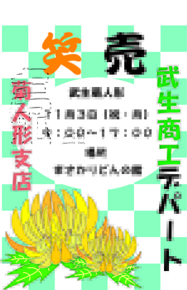 11/3(月・祝)武生商工デパート菊人形支店 2025.11.01 商業学科 武生商工デパート 11月3日(月・祝)9:00より、武生中央公園まさかりどんの館にて、武生商工デパート菊人形支店を出店いたします。 販売する商品として、特産物・パン・お菓子・和菓子・漬物をご用意いたします。 終了時間は17:00としておりますが、完売次第閉店させていただくことになっており、お早めのご来店をお待ちしております。