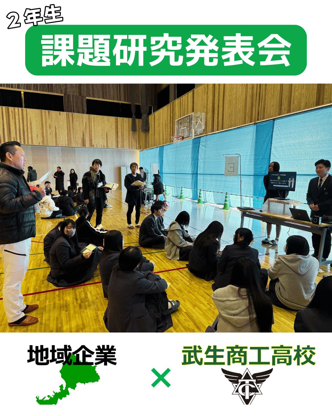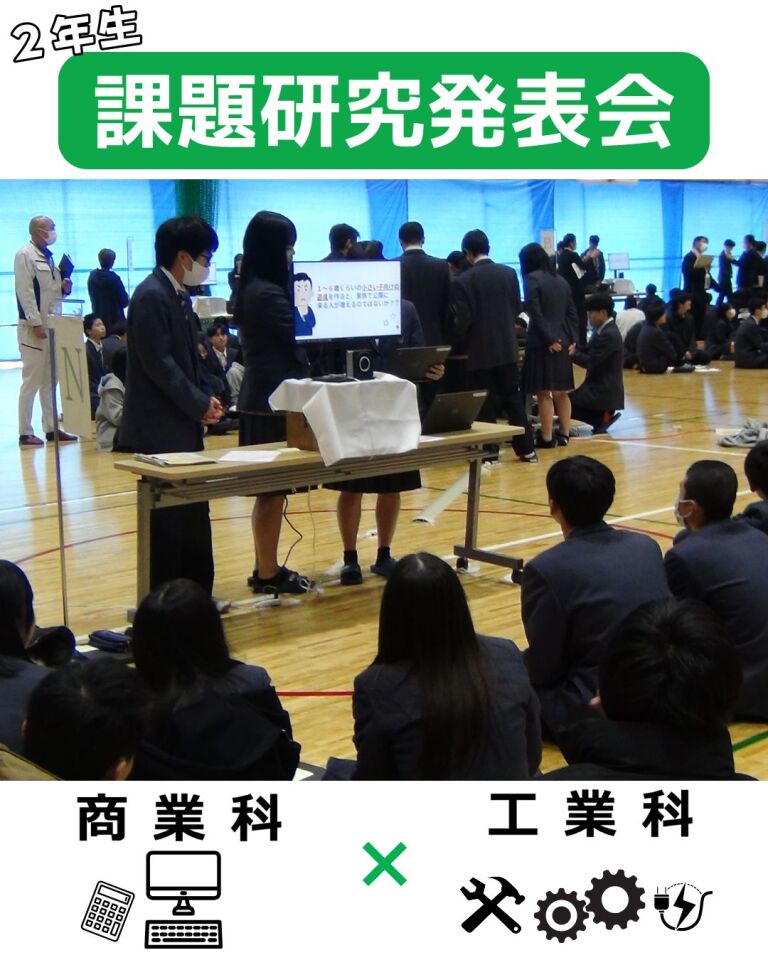 2年生の課題研究発表会が行われました。地域企業から提案されたテーマを商業科×工業科の混合グループで課題をみつけ、解決策を提案しました。