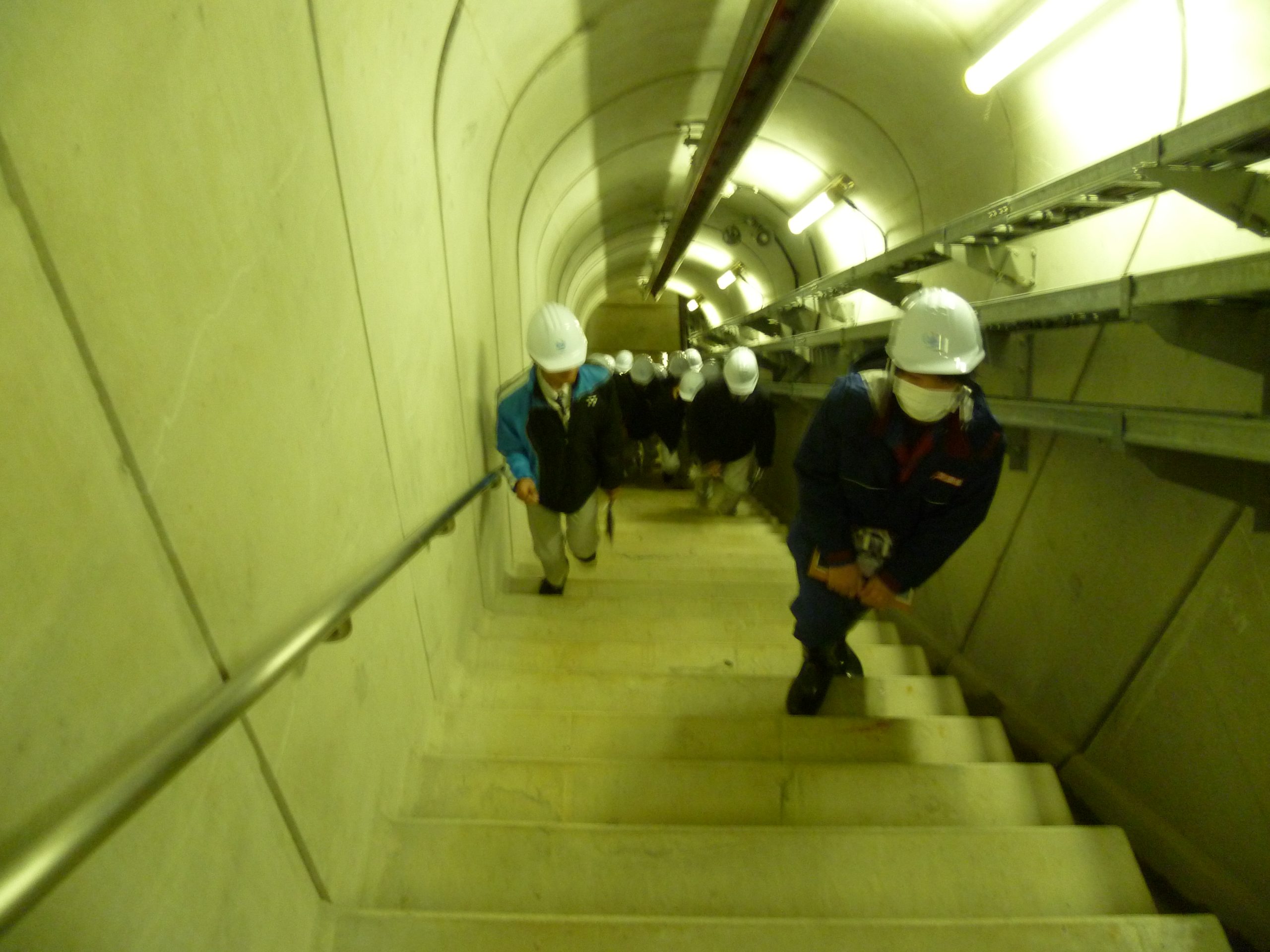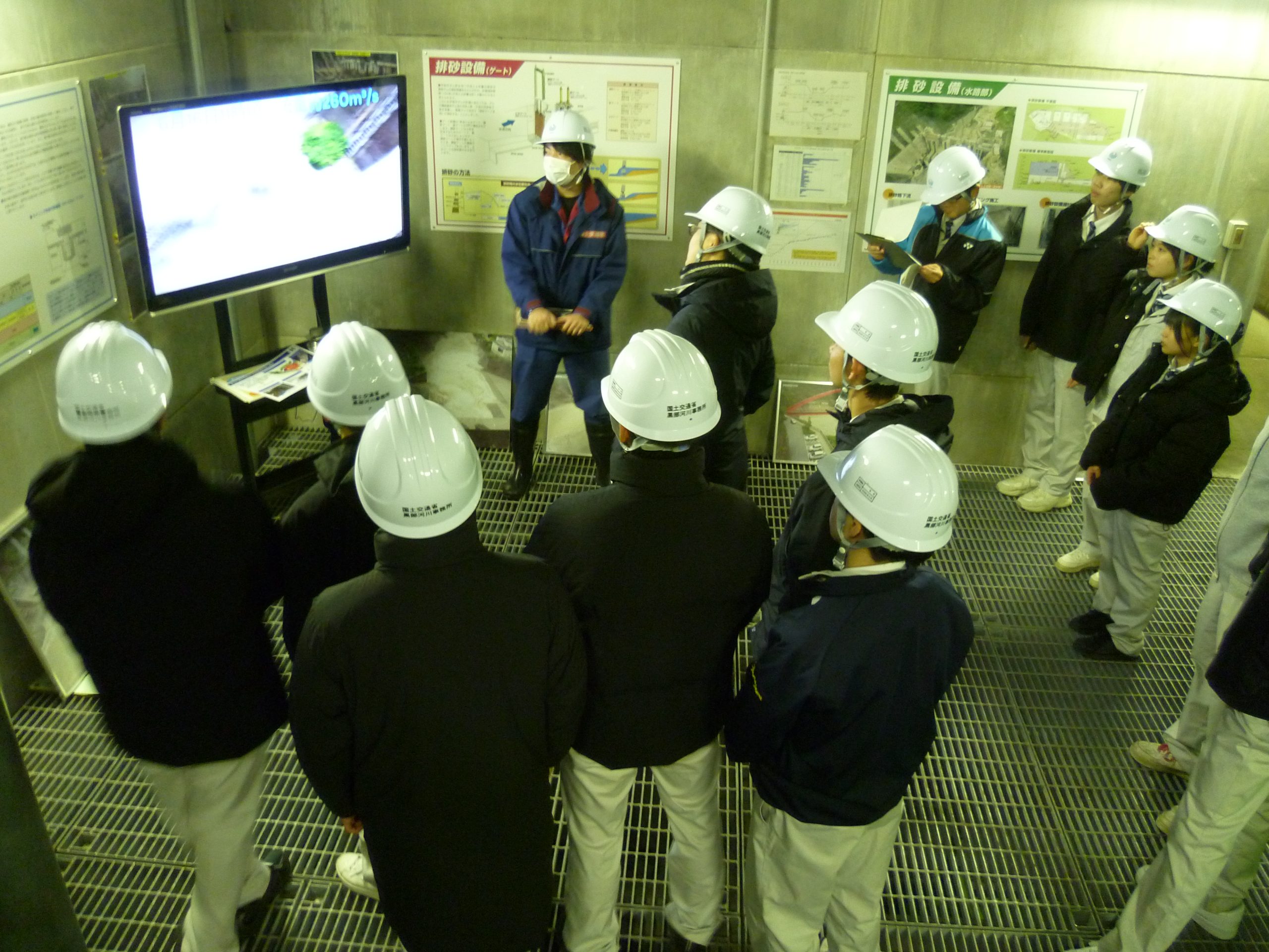 ダム本体の外部だけではなくダム内部の監査廊を歩き、排砂設備等を見学しました。