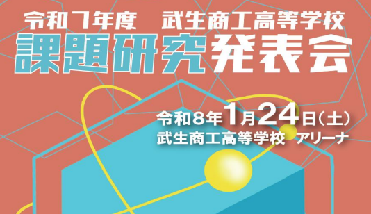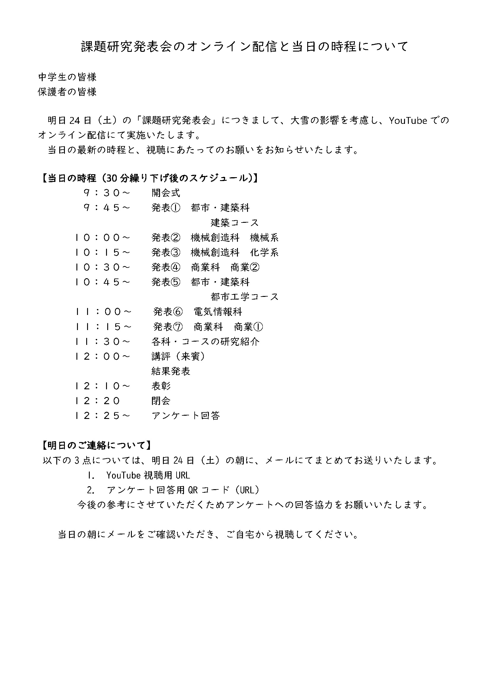 課題研究発表会オンライン配信 2026.01.23 お知らせ 中学生の皆さんへ 学校行事 授業 本日Online配信中です。下記のリンクよりご覧ください。 YouTube課題研究発表会配信中 生徒・教職員用のアンケートURLです。視聴者は必ずお答えください。 生徒・教職員用アンケートURL 1月24日(土)の「課題研究発表会」につきまして、大雪の影響を考慮し、YouTubeでオンライン配信にて実施いたします。 当日の最新の時程と、視聴に当たってのお願いをお知らせいたしますので、下のリンクを開いてご覧ください。 【中学生連絡】R7課題研究発表会時程 【課題研究発表会】要旨集